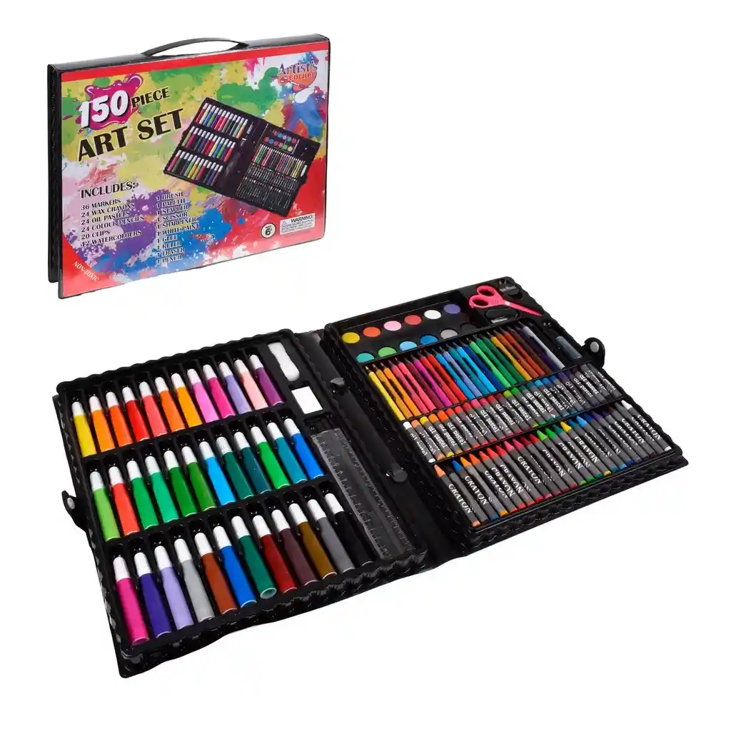 El set de arte en maleta plástica con 150 piezas es el regalo ideal para cualquier amante de la expresión creativa. Este completo kit incluye 36 marcadores vibrantes, 24 crayones de cera, 24 pasteles al óleo, 24 lápices de colores y 12 acuarelas, ofreciendo una amplia gama de opciones para crear obras maestras. Además, el set viene con 20 clips, 1 cepillo, 1 paleta, 1 grapadora, 1 tijera, 1 sacapuntas, 1 pintura blanca, 1 pegamento, 1 regla de 15 cm, 1 borrador y 1 lápiz, todo organizado en una práctica maleta de almacenamiento. Perfecto para niños de todas las edades, este set fomenta la creatividad y la imaginación mientras proporciona horas de diversión artística. Su variedad de materiales de alta calidad y herramientas versátiles permiten explorar diferentes técnicas y estilos, haciendo de este kit una opción excelente para estimular el desarrollo artístico y el amor por el arte. Ideal para cumpleaños, festividades o cualquier ocasión especial.