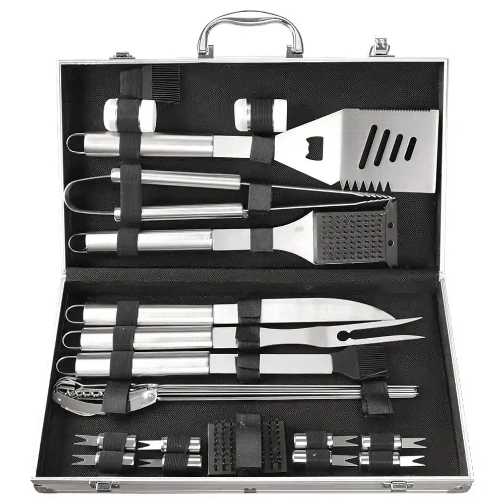 Lleva tus asados a otro nivel con este set de 25 piezas para parrilla. Viene en un maletín de aluminio resistente y elegante, ideal para guardar y transportar todo lo necesario para un asado perfecto. Incluye espátula, cuchillo, tenedor, pinchos, pinzas, escobilla con repuesto, pincel, saleros, anticuchos, abridor y más. El regalo perfecto para amantes del fuego, el sabor y la buena compañía. 🔥
