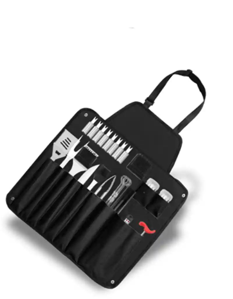 Todo lo que necesitas para ser el rey o la reina del asado 🔥 Este completo set de 26 piezas viene en una bolsa de tela resistente que puedes colgarte como delantal parrillero: práctico, elegante y funcional. Incluye espátula, cuchillo, tenedor, pinzas, pinchos, anticuchos, termómetro, jeringa para carnes, saleros, pincel y escobilla para limpiar la parrilla. Un regalo ideal para los amantes del sabor, el fuego y los buenos momentos.