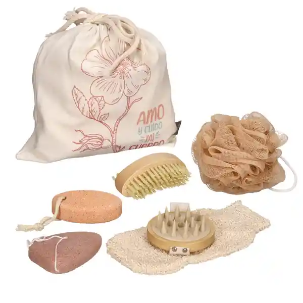 Contiene 5 Unidades. Cepillo Cabello 1 Und + Masajeador Madera 1 Und + Escobilla Uñas 1 Und + Mitón Exfoliante 1 Und + Bolsa de Algodón 1 Und. Experiencia de Spa Para Cuerpo en la Casa. Ideal Para Renovar Energías y Florecer Con Una Piel Radiante en Todo tu Cuerpo..