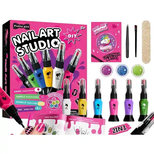 ¡Todo lo que necesitas para una manicure creativa y divertida! Este completo set incluye 6 esmaltes 2 en 1, cada uno con dos pinceles: uno grueso y otro ultra delgado, perfectos para hacer desde bases uniformes hasta los diseños más detallados. Además, trae glitter de diferentes colores, lima, un pincel y un manual de terminaciones para lograr un look de uñas único y completo. ¡Ideal para pequeñas artistas de la belleza! Medidas: 25x20cm caja