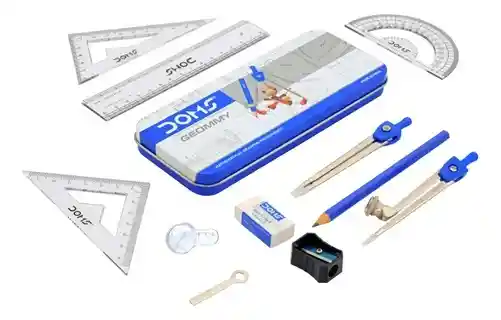 1 lupa, 1 Compas divisor, 1 Goma, 1 Lápiz grafito, 1 Regla 15cm, 1 Sacapunta, 1 compas, 1 llave, 1 transportador, 2 escuadras