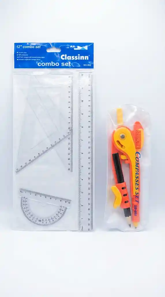 Set para geometría que incluye set de reglas (recta de 30 cm, escuadra de 18 cm, escuadra de 13 cm, transportador) y 1 compas.