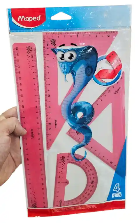 ncluye: Regla de 30cm. Escuadra 90° 19cm.. Escuadra 45° 13cm.. Transportador 180° 10cm