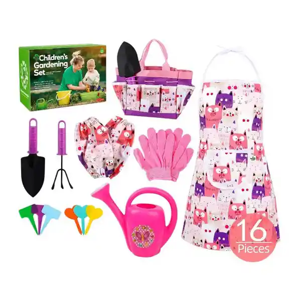 Perfecto para pequeños amantes de la naturaleza. Este adorable set incluye un bolso jardinero y delantal con diseño de gatitos, guantes, pala, rastrillo de mano, etiquetas para plantas y una regadera. Todo lo necesario para iniciarse en el mundo de la jardinería de forma entretenida y segura. ¡Ideal para jugar, aprender y cuidar sus propias plantas! Medidas: 23x18cm caja