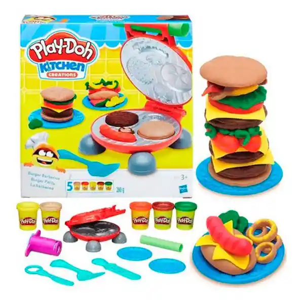 Crear almuerzos divertidos solo depende de tu imaginación con este juego Play Doh Dentro de la parrilla, los cocineros creativos pueden imaginar sus propias hamburguesas, perritos calientes, bocadillos, papas fritas y crear condimentos usando las diferentes formas y moldes Cuando la comida del picnic esté lista colóquelos en el plato y compártalos con sus amigos y familiares