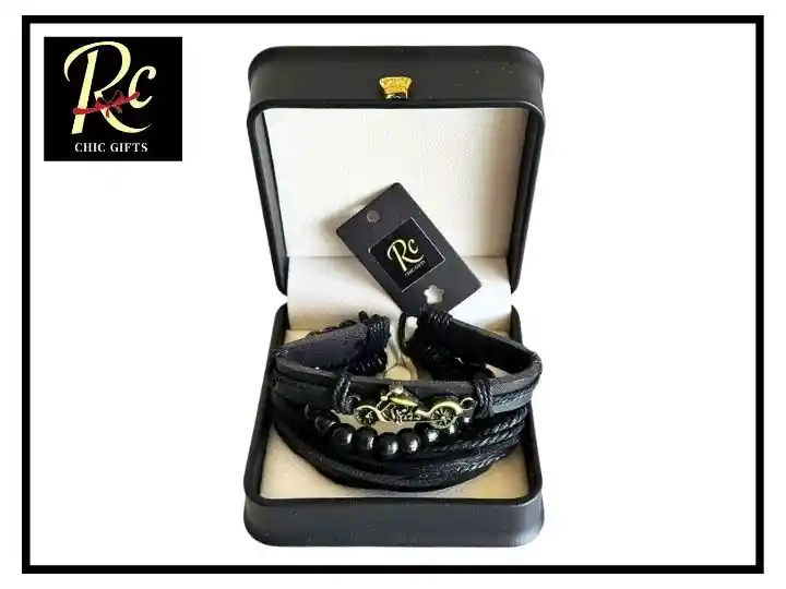 "Estilo, carácter y distinción en un solo detalle. Este set de pulseras negras con diseño trenzado, cuentas y elementos metálicos es el regalo para hombre perfecto: moderno, versátil y con presencia. Presentado en un estuche elegante con corona dorada, transmite sofisticación desde el primer vistazo. Las pulseras son fabricadas en República Dominicana, combinando diseño contemporáneo con esencia caribeña. Disponible en Regalos Chic, tu tienda experta en regalos corporativos y exclusivos. Regalo para hombre Pulseras negras hombre Pulseras trenzadas y metálicas Regalos corporativos premium Accesorios masculinos de moda Pulseras fabricadas en República Dominicana Regalos Chic Chile"