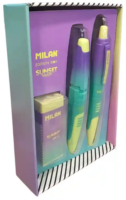 Caja de regalo rectangular pequeña con tapa deslizante de plástico transparente. Contiene 3 productos: un bolígrafo de tinta azul, un portaminas y una goma de borrar suave. Caja de regalo rectangular pequeña con tapa deslizante de plástico transparente. Contiene 3 productos: un bolígrafo de tinta azul, un portaminas y una goma de borrar blanda. Dimensiones de la caja: 13 x 11 x 4 cm. Descripción detallada del contenido: 1. Bolígrafo COMPACT de tinta azul. Longitud de escritura aproximada: 1000 metros. Punta de 1 mm. Tinta de fabricación alemana. 3. Portaminas COMPACT con mina 2B de 0,7 mm. La mina 2B es blanda, ideal para escribir y dibujar. En el extremo, bajo la carcasa, hay una goma de borrar grande. El lápiz tiene una forma robusta que facilita su agarre. 3. Goma de borrar de plástico amarillo 320, suave y delicada, versátil. Para borrar todo tipo de superficies. No daña el papel.