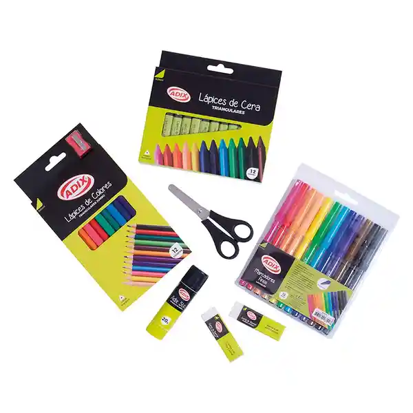 Set Incluye 7 Unidades: Lápices Cera 1 Und + Lápices de Colores 1 Und + Tijeras 1 Und + Marcadores 1 Und + Barra de Pegante 1 Und + Gomas Borradores 2 Und.