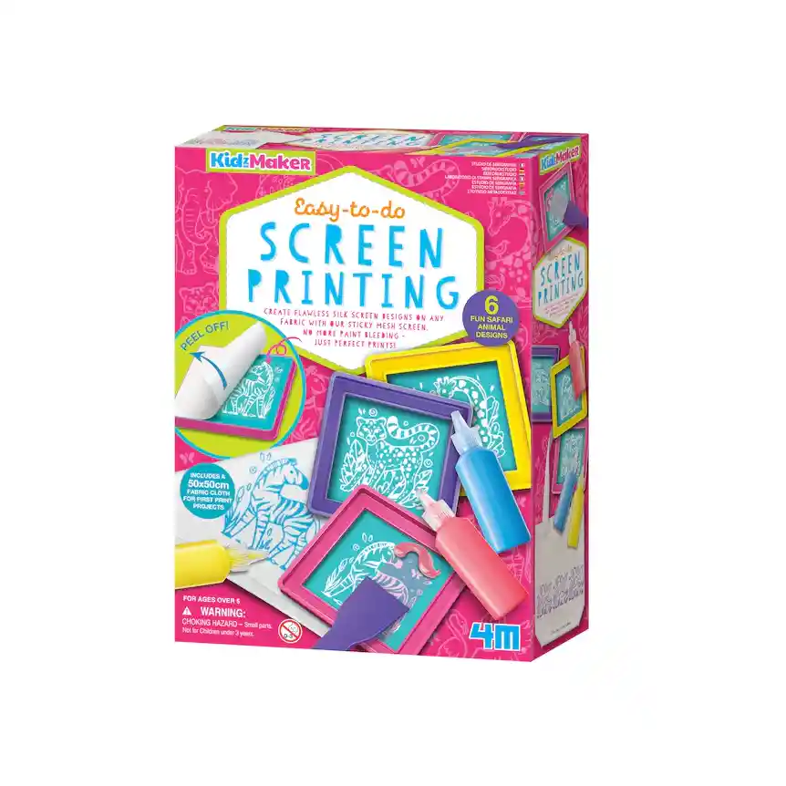 Set Estudio de Serigrafía Crear un diseño impecable de serigrafía en cualquier tela con nuestra malla adhesiva. Contenido: 6 marcos de pantalla. 2 marcos de fotos de colores que pueden variar. 1 malla adhesiva para pantalla (6 diseños) 3 botes de pintura para tela 1 paño de tela 50x50 1 hoja de cinta adhesiva de doble cara. Instrucciones detalladas.