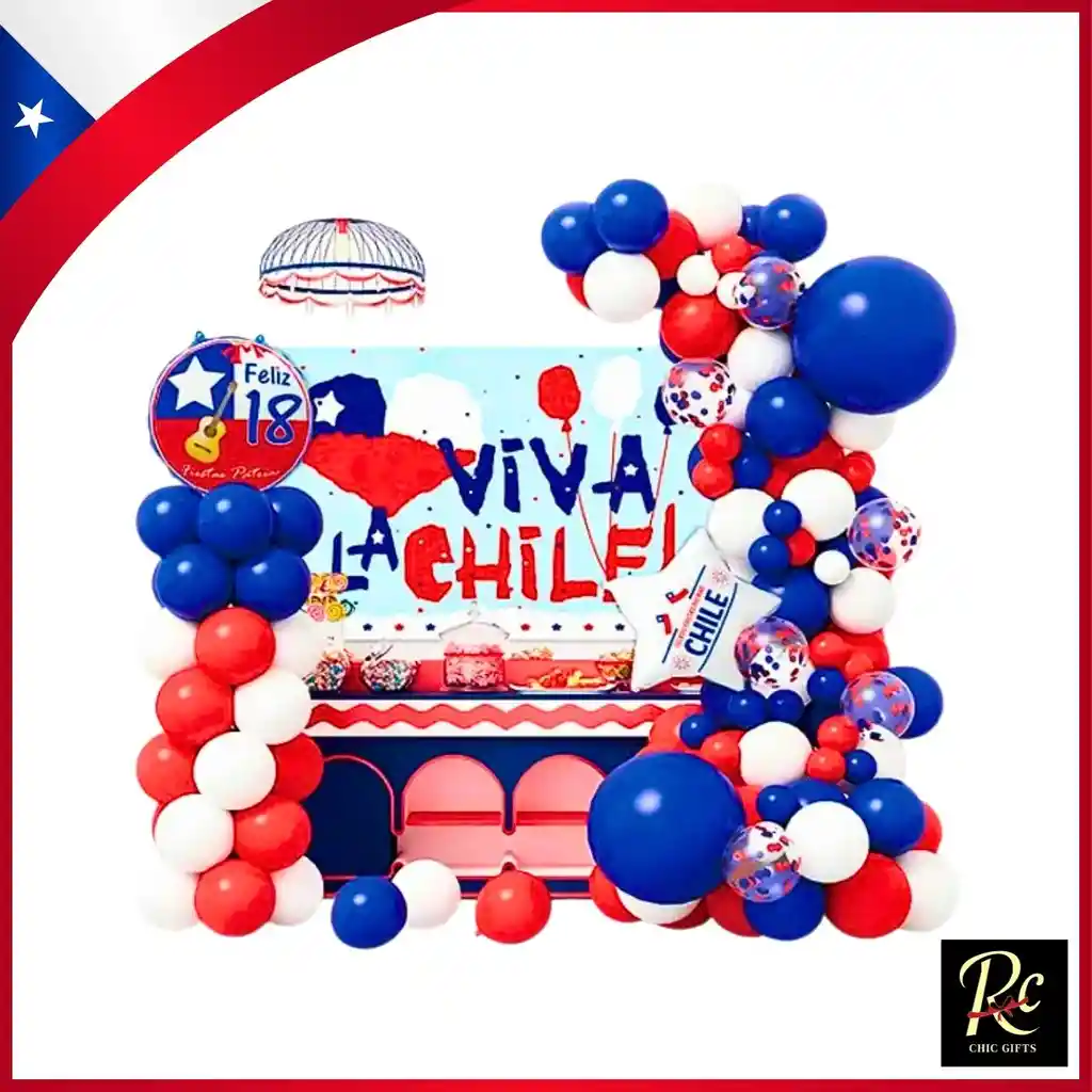 Celebra con todo el corazón este 18 de septiembre con nuestro Set Exclusivo de Decoración para Fiestas Patrias "¡Viva Chile!", un completo kit de 87 piezas diseñado para que tu espacio brille con los colores de nuestra bandera. Este set patriótico está disponible solo en Regalos Chic y es ideal para decorar casas, fondas, colegios, restaurantes, oficinas y eventos dieciocheros con un toque auténtico y festivo. Cada elemento del set ha sido cuidadosamente seleccionado para representar el espíritu chileno, incluyendo guirnaldas de banderas de Chile, globos tricolores (rojo, blanco y azul), banderines, escarapelas, rosetones y adornos patrióticos, todos fabricados con materiales resistentes y de alta calidad. Su diseño llamativo y fácil instalación te permitirá transformar cualquier espacio en minutos.