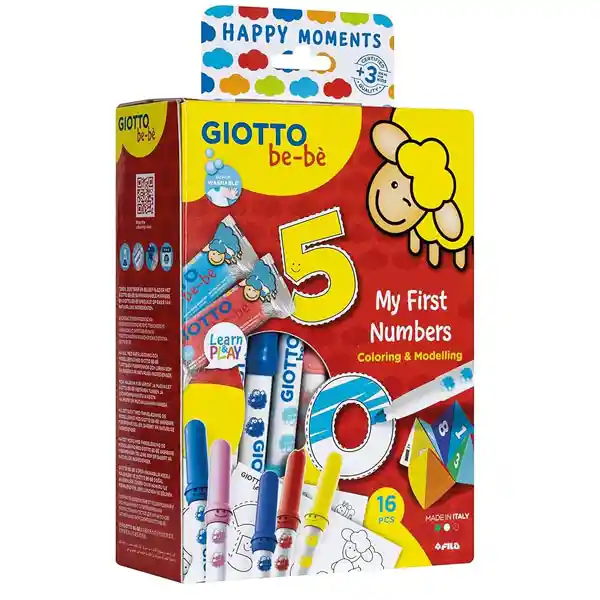 GIOTTO be-bè Happy Moments My First Numbers: Es el kit educativo y entretenido diseñado para acompañar a los más pequeños a descubrir el mundo de los números y las asociaciones a través de un enfoque de aprendizaje súper creativo. En el interior del paquete encontrarás: – 10 rotuladores súper lavables – 4 plastilina GIOTTO be-bè (cian, rojo fluo, amarillo fluo, blanco) – Un juego de 2 hojas de números para colorear y recortar – Y un fantástico origami para construir. ¡La diversión comienza ahora!