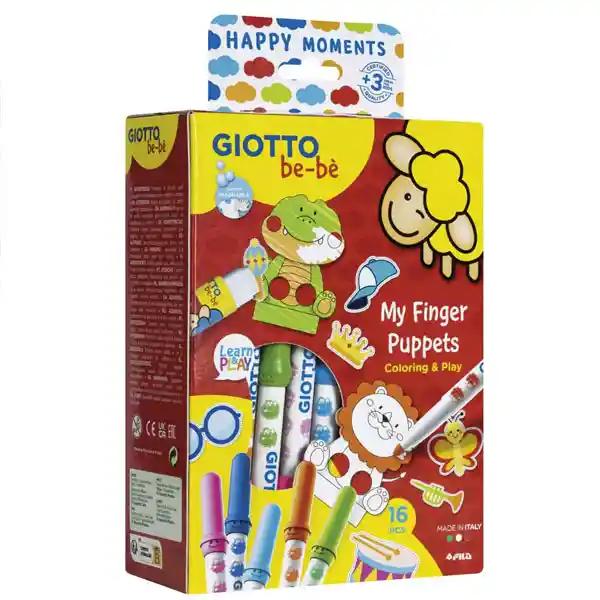 El nuevo set GIOTTO be-bè Happy Moments My Finger Puppets es perfecto para ayudar a los niños a desarrollar su primer acercamiento a la interacción y la expresión a través de los títeres de dedo. Dentro del paquete, encontrarás 4 títeres de dedo con temática de la jungla para construir: un león, un mono, un elefante y un dragón. Además, encontrará 10 puntas de fieltro GIOTTO be-bè, una barra de pegamento GIOTTO be-bè dermatológicamente probada y un escenario de doble juego. Contenido: 10 x puntas de fieltro Giotto be-bè; 1 x pegamento en barra 20gr Giotto be-bè; 1 escenario de doble play; 4 x títeres de dedo precortados temas de la jungla: león, elefante, mono, dragón