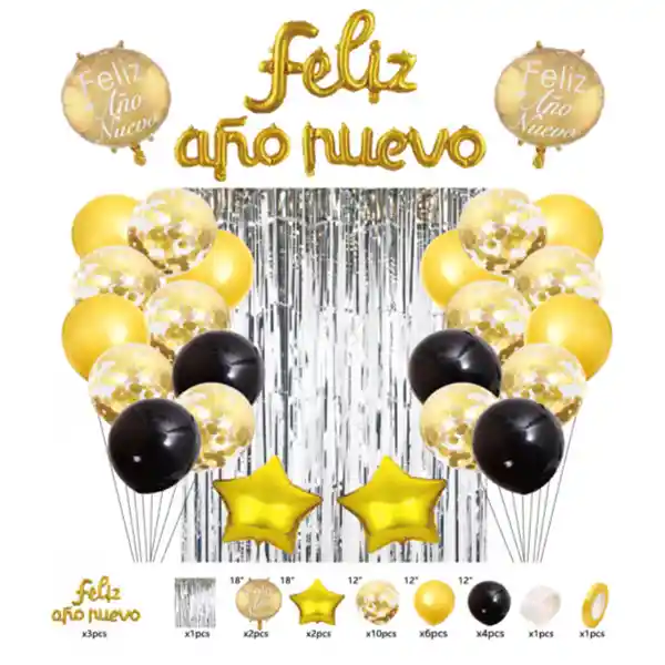 SET GLOBO MYLAR/BANNER/CORTINA FELIZ AÑO GOLDEN BLACK 30 PIEZAS