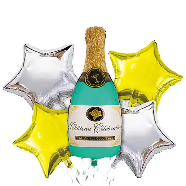 SET GLOBOS METALIZADOS BOTELLA CHAMPAGNE + 4 ESTRELLAS