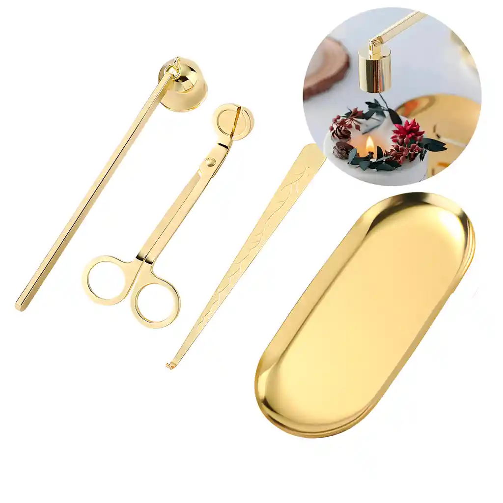 Set Herramientas Dorado Recortadora Dosificador 4 Piezas Para Velas Este set de accesorios para velas está fabricado en acero inoxidable de alta calidad, lo que garantiza una excelente resistencia al uso constante y una larga vida útil. Su acabado elegante y detallado no solo cumple una función práctica, sino que también aporta un toque decorativo refinado a cualquier espacio del hogar. Cada herramienta está diseñada para ofrecer un cuidado completo a tus velas. El cortador de mechas permite mantener la longitud adecuada de la mecha, evitando el exceso de humo y alargando el tiempo de combustión. El apagador tipo campana ayuda a extinguir la llama sin salpicar cera ni generar humo, mientras que el gancho está pensado para sumergir la mecha encendida, protegiéndola y facilitando su próximo encendido. La bandeja incluida mantiene todo en orden y recoge los restos, evitando suciedad alrededor de tus velas. Las dimensiones aproximadas son: cortador de 18,5 cm, gancho de 22 cm, apagador de 20 cm y bandeja de 23 x 9.5 cm. El diseño pulido de cada pieza combina funcionalidad y estilo. Gracias a su presentación cuidada, este juego no solo es una herramienta útil, sino también un excelente regalo para quienes disfrutan de la calidez y atmósfera que entregan las velas. Perfecto para usar en comedores, baños, cocinas, tocadores o cualquier rincón especial del hogar. También es ideal para ocasiones especiales como bodas, celebraciones o simplemente para quienes valoran los detalles elegantes en su rutina diaria. El set incluye 4 piezas: cortador de mechas, gancho, apagador y bandeja. Especificaciones: Tamaños: 18 CM, 22 cm, 20 cm, 23.5 cm. Colores: Dorado Contenido de paquetes 4 piezas para velas
