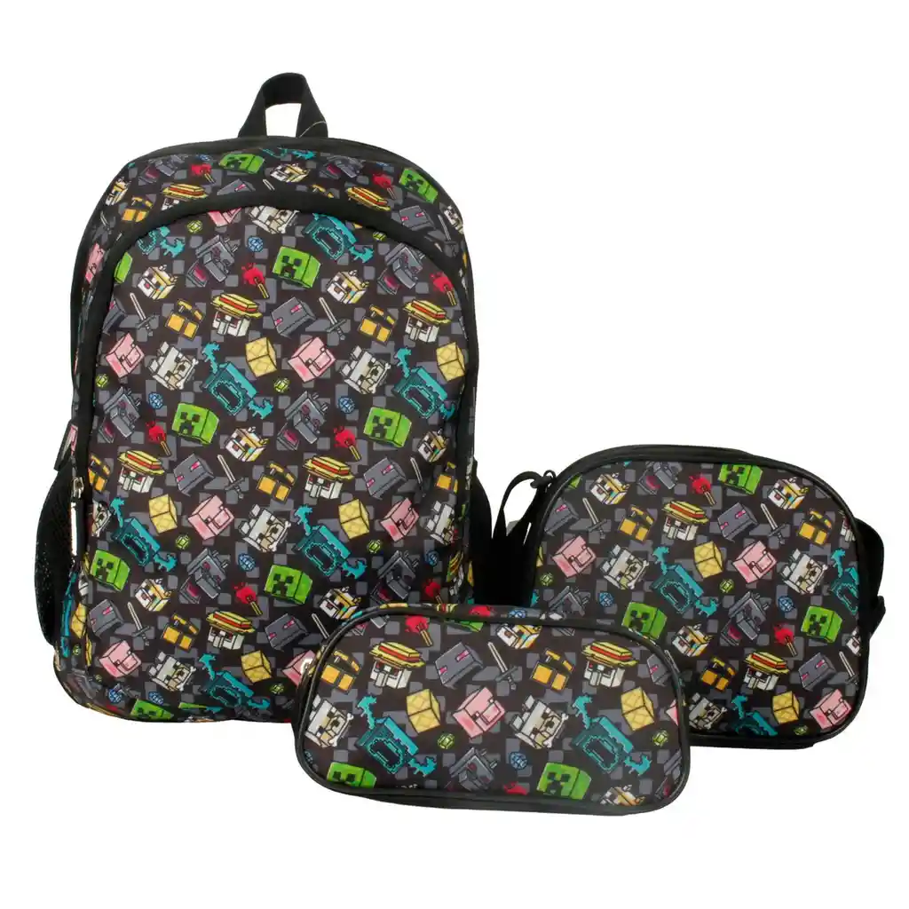 Este set juvenil de Minecraft es el sueño de cualquier fanático del juego. Con su diseño inspirado en el mundo pixelado y aventurero de Minecraft, incluye una mochila, una lonchera y un estuche que te acompañarán en todas tus travesuras diarias. Cada pieza está decorada con los icónicos bloques y personajes del juego, lo que le da un toque único y lleno de creatividad. La mochila, resistente y espaciosa, te permite llevar todo lo que necesitas para un día lleno de acción, mientras que la lonchera te asegura que tu comida esté lista para la próxima misión. El estuche, práctico y funcional, guarda todos tus útiles para que nunca pierdas una herramienta en el camino. Este set no solo es perfecto para organizar tu día a día, sino que también te transporta al universo de Minecraft, donde todo es posible y la aventura nunca termina. ¡Es el regalo ideal para los jóvenes exploradores que siempre están listos para el próximo reto! Medidas Mochila: 25 x 13 x 44 cms. Capacidad Mochila: 14 litros. Medidas Lonchera: 22 x 8 x 20 cms. Capacidad Lonchera: 3,5 litros. Medidas Estuche: 21 x 6 x 11 cms. Capacidad Estuche: 1,4 litros. Materialidad: Poliester (Todos)