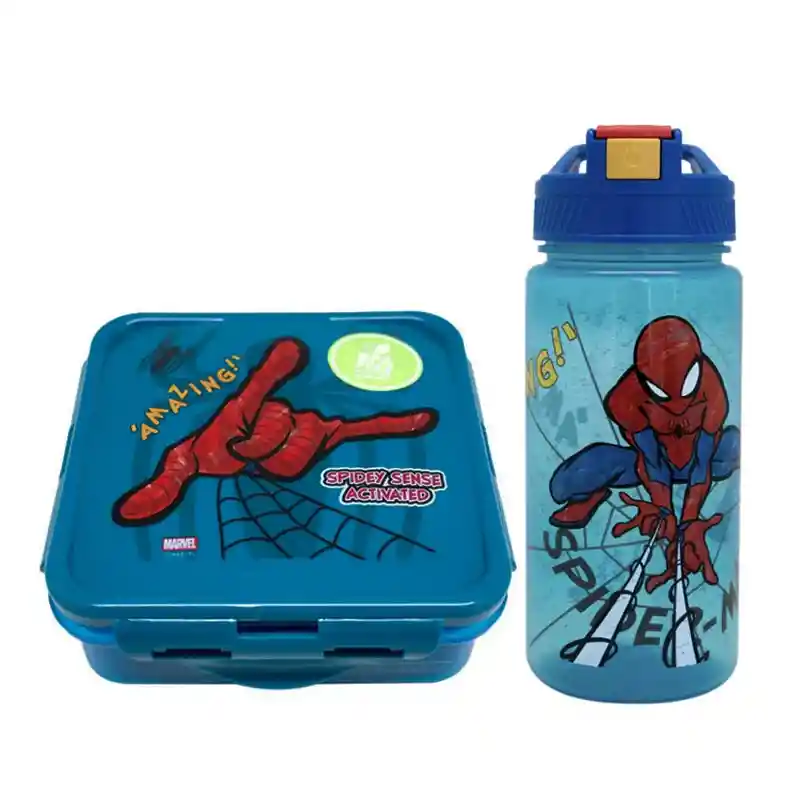 Material: Plástico (Libre de BPA). Medida del Tupper: 21 cm x 16 cm x 7 cm (Aprox). Capacidad de la Botella: 500 ML (Aprox). Diseño: Spider-Man. Contenido: 1 tupper, 1 botella con bombilla y tapa antiderrame. . Este set infantil de lonchera y botella es ideal para transportar alimentos y bebidas de forma práctica, permite llevar colaciones, almuerzos y líquidos de manera organizada, ayudando a mantener los alimentos protegidos y fomentando hábitos de alimentación e hidratación saludable en los niños. . Sirve para guardar alimentos como frutas, sándwiches, galletas, cereales, snacks o colaciones livianas. . Contiene una botella con bombilla para que los niños lleven su jugo, agua o leche sin riesgo de derrames y un tupper con tapa segura. . Ideal para acompañar a los más pequeños en sus rutinas escolares y recreativas, brindando comodidad, orden y practicidad con un diseño llamativo
