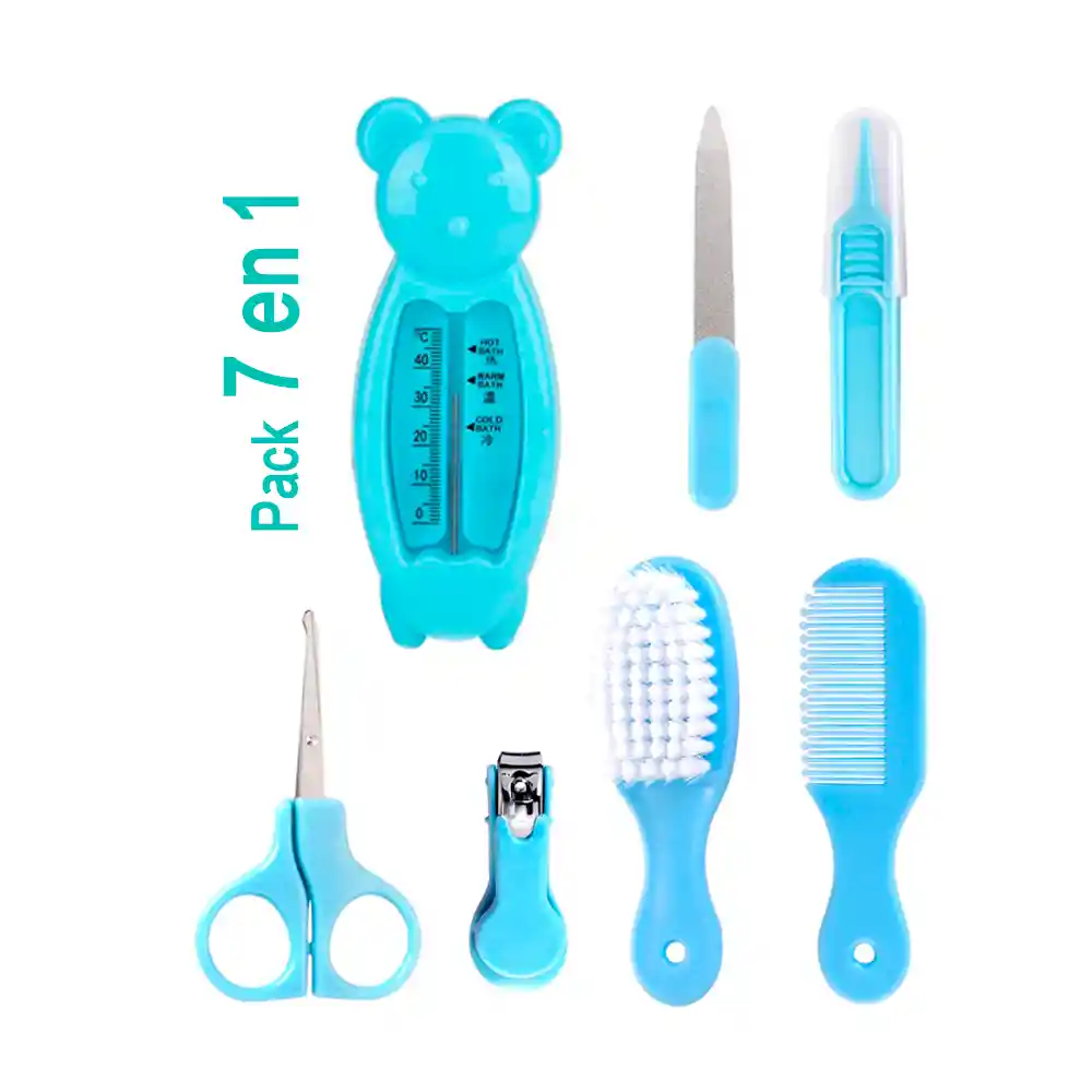 Material: Acero Inoxidable y Plástico Color: Celeste Paquete: 1 Peine / 1 Cepillo de Cabello / 1 Cortauñas / 1 Lima/ 1 Termómetro / 1 Pinza / 1 Tijera Práctico pack de higiene para mantener a tu bebé bien cuidado y saludable en todo momento Ideal para regalo de baby shower o cumpleaños, super util y práctico