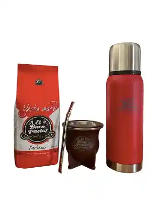 Set Matero El Buen Pastor: -Incluye mate modelo camionero de material plástico 3D. LIBRE DE BPA, color Marrón -Termo de 1.0 LT en Acero Inoxidable. DURACION DE TEMPERATURA: 6 hrs agua caliente y 8 hrs agua caliente, termo Rojo. -Bombilla de Acero Inoxidable plana, 19 cm de largo. -Yerba Mate El Buen Pastor Tradicional Barbacuá