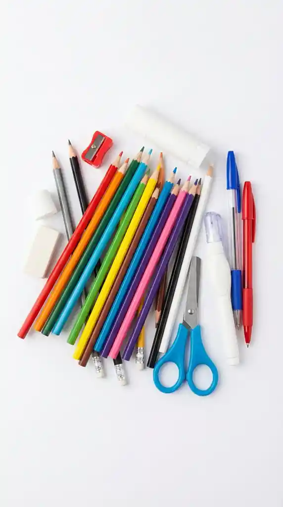Set para el estuche que incluye: 1 caja de lápices de 12 colores. 2 Lápiz mina 1 Goma de borrar. 1 Sacapunta. 1 Pegamento en barra chico (80 gr) 2 Lápices pasta 1 azul y 1 rojo. 1 Corrector tipo lápiz. 1 Tijera punta roma NO incluye estuche.