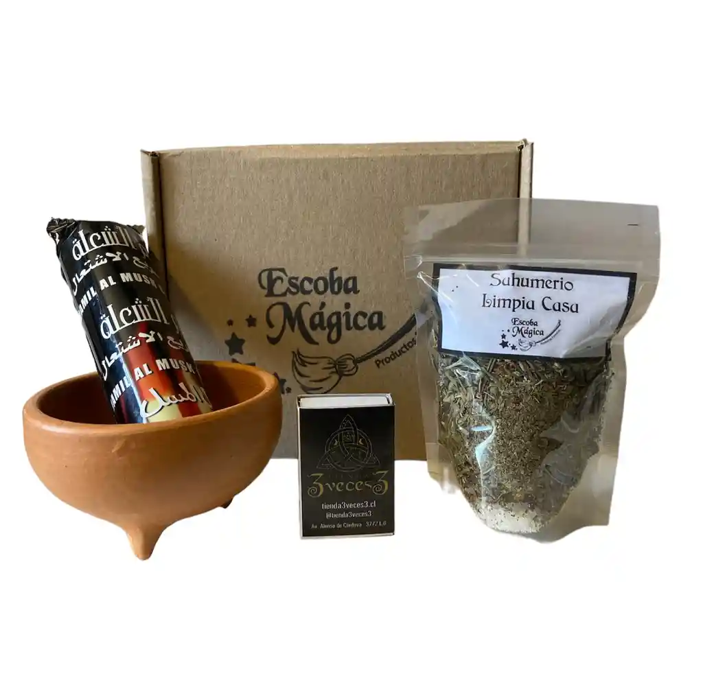 SAHUMERIO 100% NATURAL LIMPIA CASA Caja con bolsa de sahumerio preparado con la mezcla exacta de Albahaca, Alcanfor, Laurel, Romero, Ruda, Mirra y Copal Oro. Además incluye pocillo de greda, carbón al almizcle, manual y fósforos.