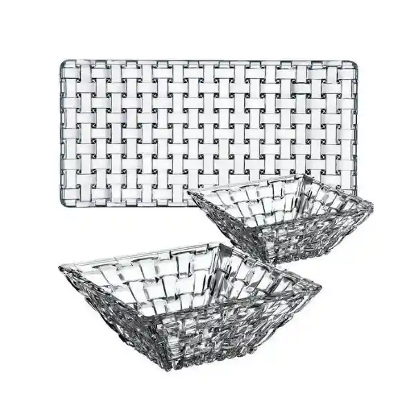 Set Contiene 3 Unidades. Piezas Para Usar Juntas o Por Separado. Consta de un Plato Rectangular Más Dos Pocillos Todo Cristal. Agrega Brillo a Cada Día Así Como Decoraciones Para Momentos Especiales. El Plato Con Los Dos Pocillos Proporciona un Escenario Para Comidas Bellamente Presentadas. Además Los Dos Pocillos Encajan Exactamente Sobre el Plato Rectangular. Hermosa Adición a su Colección de Mesa o el Regalo Perfecto Para Regalar. Características Técnicas Largo: Plato 280 cm y 120 cm Cada Fuente. Ancho: Plato 140 cm y 120 cm Cada Fuente.