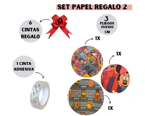 El set incluye 3 pliegos de papel de regalo navideño (los de la imagen), 6 cintas de regalo roja y una cinta adhesiva. Todo para envolver tus regalos de navidad!