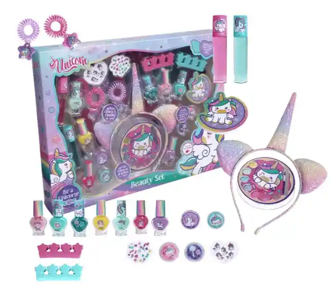 La Magia de Unicornio llegó para conquistar a todas las niñas con este increíble set de maquillaje. Incluye cintillo de Unicornio y collets para vivir por completo la magia y fantasía de los unicornios. Los esmaltes son a base de agua y no tóxicos. Set Contiene: 7 Esmaltes de Uñas Paleta de Brillos (7 colores) 2 Brillos de Labios 2 Sombras de Ojos 2 Separadores de dedos 2 Glitter 2 Collet Lima Cintillo 2 Stickers
