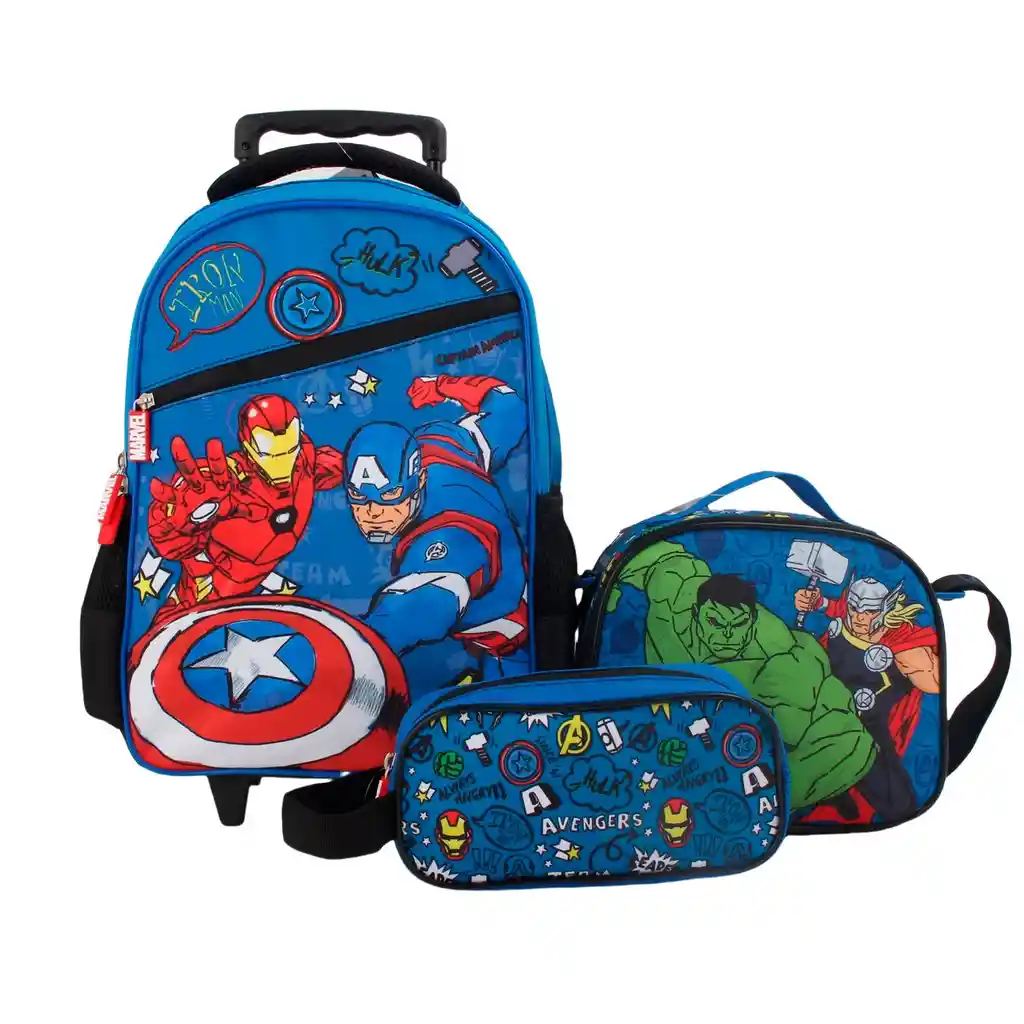 ¡Prepárate para un regreso a clases lleno de estilo y comodidad! Nuestro set promocional de vuelta a clases, del increible mundo de Avengers, es todo lo que los niños necesitan para afrontar su jornada escolar con energía, organización y mucha diversión. Este set incluye una práctica mochila con ruedas, una lonchera adorable y un estuche, todo diseñado para hacer que cada día sea más fácil, cómodo y emocionante. ¡Porque la vuelta a clases es una oportunidad para brillar con estilo! Medidas Mochila: 25 x 13 x 44 cms. Capacidad Mochila: 14 litros. Medidas Lonchera: 22 x 8 x 20 cms. Capacidad Lonchera: 3,5 litros. Medidas Estuche: 21 x 6 x 11 cms. Capacidad Estuche: 1,4 litros. Materialidad: Poliester (Todos)