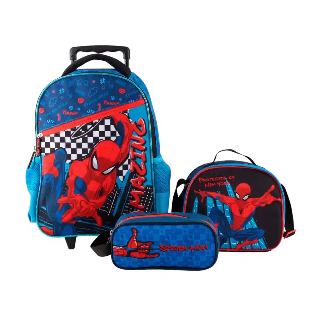 ¡Prepárate para un regreso a clases lleno de estilo y comodidad! Nuestro set promocional de vuelta a clases, del increible mundo de Spiderman, es todo lo que los niños necesitan para afrontar su jornada escolar con energía, organización y mucha diversión. Este set incluye una práctica mochila con ruedas, una lonchera adorable y un estuche, todo diseñado para hacer que cada día sea más fácil, cómodo y emocionante. ¡Porque la vuelta a clases es una oportunidad para brillar con estilo! Medidas Mochila: 25 x 13 x 44 cms. Capacidad Mochila: 14 litros. Medidas Lonchera: 22 x 8 x 20 cms. Capacidad Lonchera: 3,5 litros. Medidas Estuche: 21 x 6 x 11 cms. Capacidad Estuche: 1,4 litros. Materialidad: Poliester (Todos)