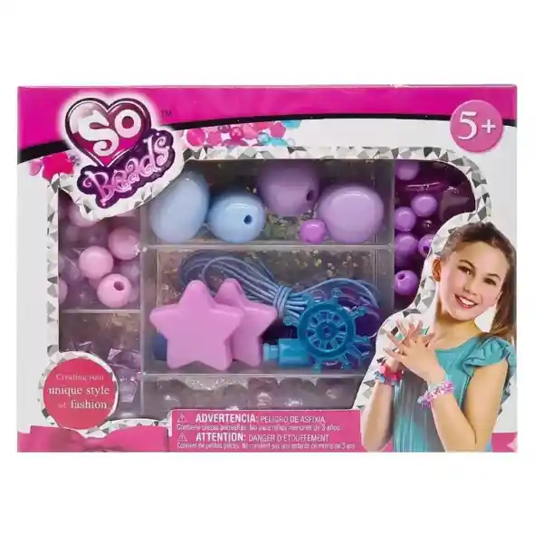 Crea tu propio estilo de moda con el set So Beads para hacer pulseras. Incluye mostacillas de diferentes formas y colores, cordones y accesorios para diseñar pulseras únicas. Ideal para estimular la creatividad y la motricidad fina en niñas. ESPECIFICACIONES - Contiene variedad de mostacillas y cordones. - Recomendado para niñas desde 5 años. - Fácil de usar, no requiere herramientas adicionales. RECOMENDACIONES - Utilizar bajo supervisión de un adulto. - No apto para menores de 3 años por riesgo de asfixia. - Perfecto para actividades creativas y regalos.