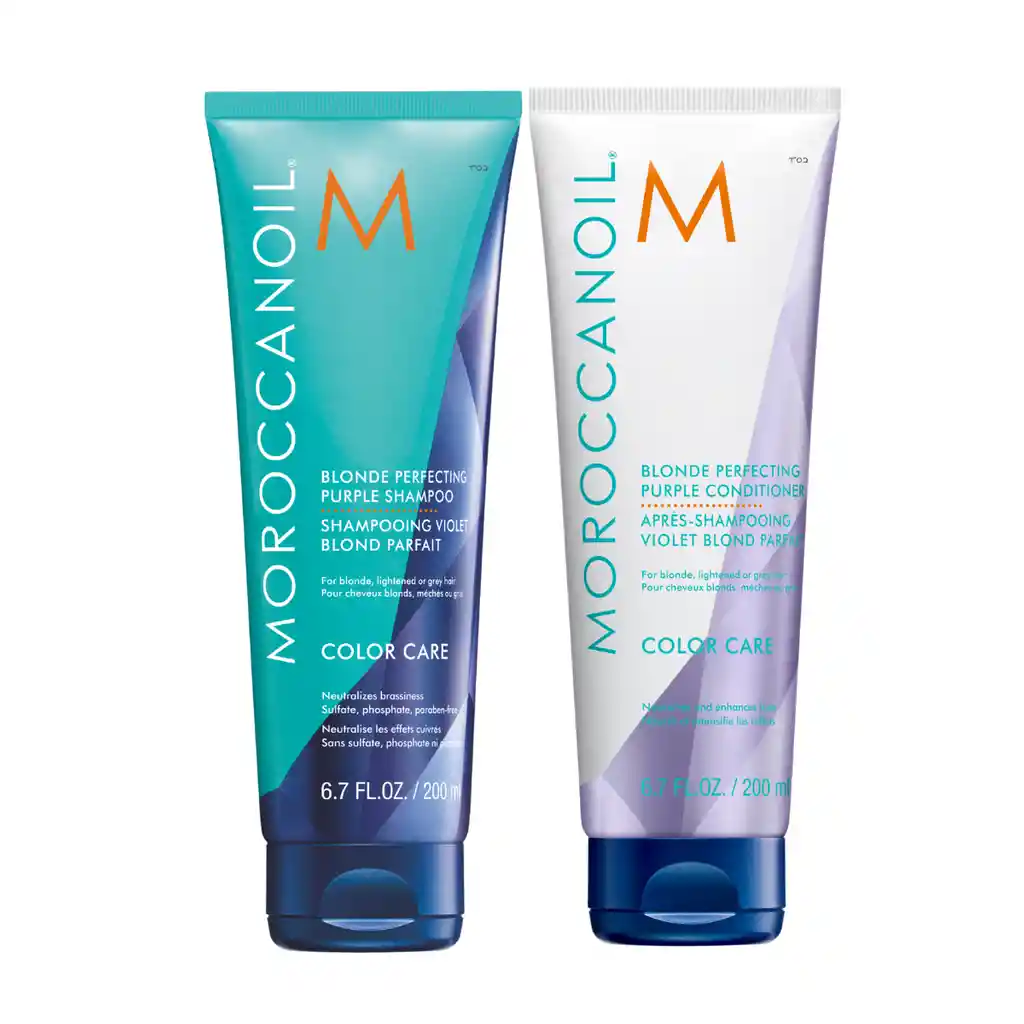 Set ideal para cabellos rubios o con mechas. Incluye shampoo, acondicionador y tratamiento de argán violeta para neutralizar tonos amarillos, hidratar profundamente y mantener el rubio frío, brillante y saludable en cada lavado. El Set Rubio Perfecto Color Care de Moroccanoil es un tratamiento completo para cuidar, hidratar y proteger cabellos rubios, con mechas o decolorados. La fórmula sin sulfatos limpia suavemente, mientras protege el color y fortalece la fibra capilar desde el interior. Perfecto para rubios platinados, canosos o con balayage, este set se convierte en la rutina indispensable para prolongar el color y mejorar la textura del pelo. Set incluye Shampoo Color Care Violeta 200 ml Acondicionador Color Care Violeta 200 ml