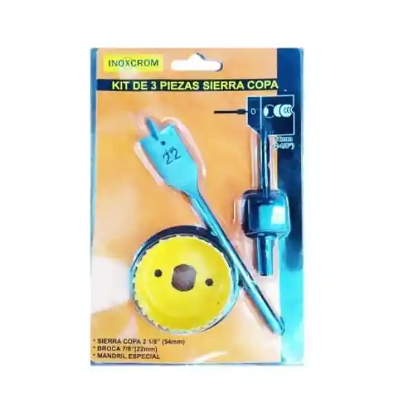 Incluye: 1 sierra copa 2 1/8" (54mm) 1 broca plana 7/8" (22mm) 1 mandril especial