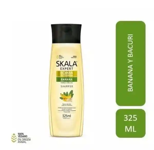 Shampoo Skala Brasil Banana y Bacuri 325 ml, ideal para nutrir e hidratar el cabello seco o debilitado. Su fórmula vegana, sin sal, siliconas ni parabenos, limpia suavemente mientras fortalece la fibra capilar, aporta brillo y ayuda a controlar el frizz. Apto para todo tipo de cabello y para uso diario.