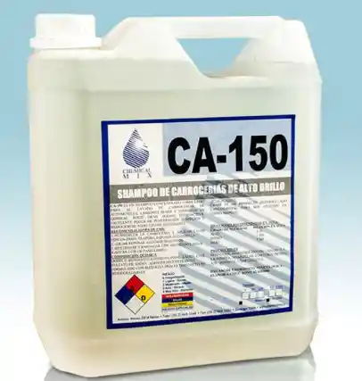 Shampoo de carrocerías de alto brillo CA-150 de Chemical Mix, ideal para limpieza de vehículos en talleres y empresas de transporte. Fórmula concentrada de 5 litros que garantiza un acabado brillante y protege la pintura de la corrosión, manteniendo la apariencia impecable de los vehículos.