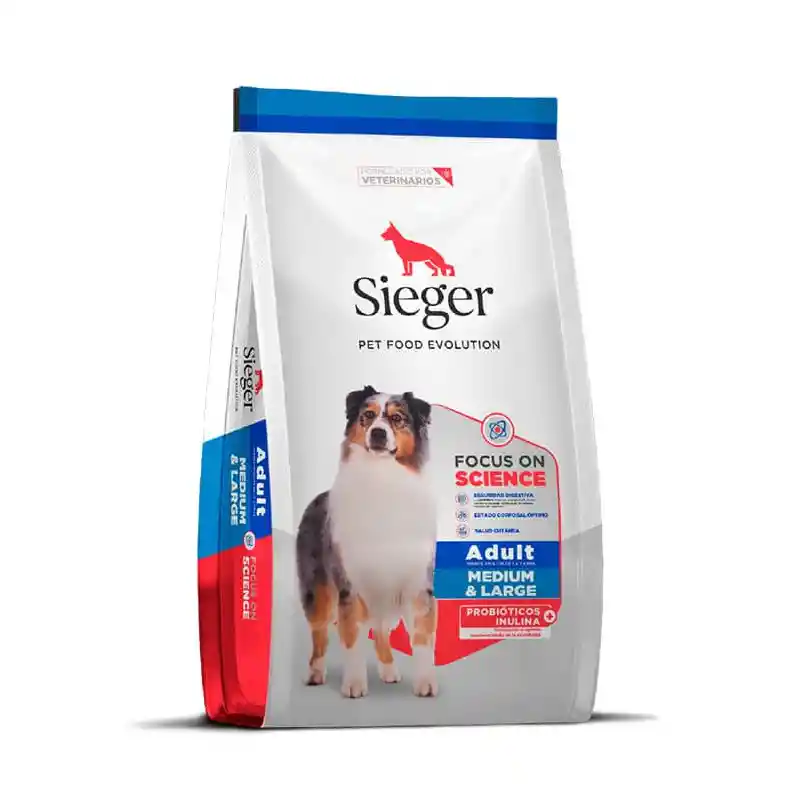 Sieger Adult Medium Largel Breeds es un alimento indicado para perros adultos de tamaño mediano y grande. Contiene una combinación de nutrientes que contribuye con el óptimo funcionamiento del sistema digestivo, colabora en mantener saludable el sistema inmunológico y favorece la salud de la piel. Los perros de estructura mediana y grande requieren de una nutrición a medida que le aporte nutrientes que ayuden a reforzar las estructuras de sostén; por lo que la inclusión de Glucosamina y Condroitín sulfato, junto con el balance óptimo de calcio y fósforo es clave.
