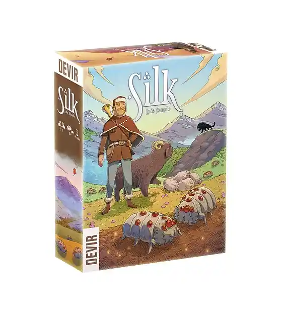 Las orugas de seda Imomushi solo pueden vivir en los picos fríos de las montañas Akaishi, y producen la seda más delicada y cara del mundo. Muy pocas personas pueden soportar las dificultades de la vida solitaria que lleva un pastor de orugas de seda gigantes. Es una existencia solitaria que requiere gran dedicación y fuerza de carácter para soportar las presiones que surgen de competir con los pocos pastores que luchan por las escasas pero deseables zonas de alimentación, mientras mantienen a raya la temible Okamy, que amenaza con comerse a estas indefensas orugas. Silk es un juego de puerta de entrada a los sistemas de control de área y colocación de trabajadores. Los jugadores tienen que mover sus orugas de seda a los espacios óptimos para que puedan alimentarse del mejor pasto disponible, mientras empujan las piezas de los otros jugadores a terrenos de alimentación menos deseables. En este juego, los jugadores deben tirar los dados para determinar qué acciones pueden realizar durante su turno. Hay seis tipos de acciones disponibles: criar más gusanos de seda, mover al pastor o su mastín, construir cercas o granjas, mover al monstruo Okami alrededor del tablero y, lo que es más importante, conseguir que los orugas de seda se alimenten. Cuando las orugas de seda se alimentan, generan una serie de puntos de victoria, según el tipo de terreno en el que se encuentren en ese momento. Estos puntos pueden usarse para modificar el resultado de una tirada de dados, volviendo al juego más estratégico. Por el tipo de juego y mecánicas, Silk se podría considerar como un “destruye amistades”, principalmente por tener la capacidad directa de perjudicar a los demás jugadores, esto lo vuelve un juego sumamente entretenido y competitivo.