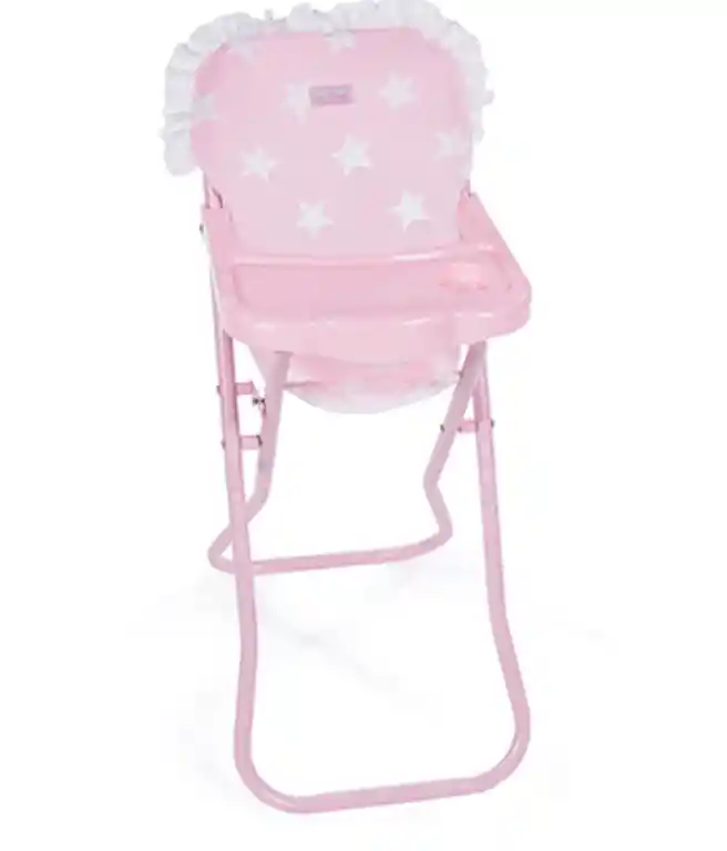 Silla con bandeja ideal para jugar a dar de comer a las muñecas. De hermoso diseño con estampado de estrellas. Se pliega fácilmente para que sea sencillo guardarla en cualquier parte. Ideal para muñecas de 36 a 52 cm.