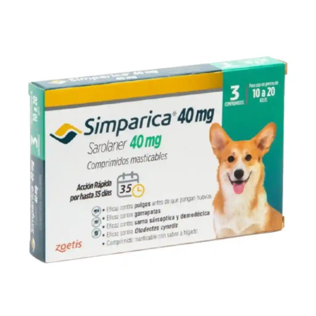 SIMPARICA® 40 mg de ZOETIS® es un comprimido masticable indicado para el tratamiento de infestaciones por pulgas, garrapatas y tratamiento de la sarna sarcóptica (Sarcoptes Scabiei), Sarna demodécica (Demodex Canis) y sarna Otodéctoca (Otidectes Cynotis) en perros de 10 a 20 Kg de peso. Este medicamento tiene un color marrón jaspeado con bordes redondeados y un buen sabor, para evitar el rechazo por parte de la mascota. ZOETIS® es una de las mayores empresas productoras de medicamentos y vacunas para mascotas y ganado, se basa en una historia de 6 décadas y en un singular enfoque en la salud animal para proporcionar productos para ellos y servicios de calidad para quienes los crían y cuidan. Las ventajas de este producto son: Para el tratamiento de las infestaciones por garrapatas (Dermacentor reticulatus, Ixodes hexagonus, Ixodes ricinus y Rhipicephalus sanguineus). El medicamento veterinario tiene una actividad inmediata y persistente para producir la muerte de las garrapatas de, al menos, 5 semanas. Para el tratamiento de las infestaciones por pulgas (Ctenocephalides felis y Ctenocephalides canis). El medicamento veterinario tiene una actividad inmediata y persistente para producir la muerte de las pulgas procedentes de nuevas infestaciones de, al menos, 5 semanas. El medicamento puede ser utilizado como parte de la estrategia en el tratamiento para el control de la dermatitis alérgica por picadura de pulga (DAP). Para el tratamiento de la sarna sarcóptica (Sarcoptes scabiei). ADVERTENCIA Es necesario que los parásitos hayan iniciado su alimentación sobre el hospedador para estar expuestos al sarolaner; por tanto, la transmisión de enfermedades infecciosas no puede ser excluida. COMPOSICIÓN Cada comprimido Simparica 5 mg contiene: Sustancia activa: Sarolaner 5 mg Excipientes: Succinato de acetato de hipromelosa, de grado medio Lactosa monohidrato Glicolato de sodio de almidón Sílice coloidal anhidra Estearato de magnesio Almidón de maíz Azúcar Glucosa líquida (81,5% sólidos) Polvo seco de hígado porcino Hidrolizado de proteína vegetal Gelatina tipo A Germen de trigo Hidrogenofosfato de calcio anhidro VÍA DE ADMINISTRACIÓN Y DOSIS Administración Oral Dosis del producto: Los comprimidos pueden administrarse con o sin alimento. El medicamento debe administrarse a la dosis de 2-4 mg/kg de peso vivo de acuerdo a la siguiente tabla de dosificación: Peso vivo (kg) Concentración del comprimido (mg de sarolaner) Nº comprimidos a administrar 1,3 – 2,5 5 1 2,5 - 5 10 1 5 - 10 20 1 10 - 20 40 1 20 - 40 80 1 40 - 60 120 1 60 Combinación apropiada de comprimidos Se debe utilizar una combinación apropiada de las concentraciones disponibles para alcanzar la dosis recomendada de 2-4 mg/kg. Los comprimidos de Simparica son masticables y apetitosos y bien consumidos por los perros cuando son ofrecidos por los dueños. Si el comprimido no es ingerido voluntariamente por el perro, puede ser administrado con comida o directamente en la boca. Los comprimidos no deben ser partidos. Pauta de tratamiento: . Para un control óptimo de infestaciones por pulgas y garrapatas, el medicamento debe ser administrado a intervalos mensuales durante la estación de pulgas y garrapatas en base a la situación epidemiológica local. Para el tratamiento de la sarna sarcóptica (causada por Sarcoptes scabiei var. canis), administrar una única dosis mensual durante dos meses consecutivos.