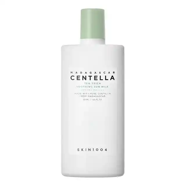 Protector solar facial calmante con centella asiática de Madagascar y complejo Tea-Trica, diseñado para proteger eficazmente la piel de los rayos UV mientras hidrata y ayuda a reducir rojeces e irritaciones, su textura ligera tipo leche se absorbe rápidamente sin dejar sensación grasa ni residuos blancos, ideal para piel sensible, mixta o con tendencia al acné, uso diario, producto original SKIN1004, hecho en Corea del Sur.