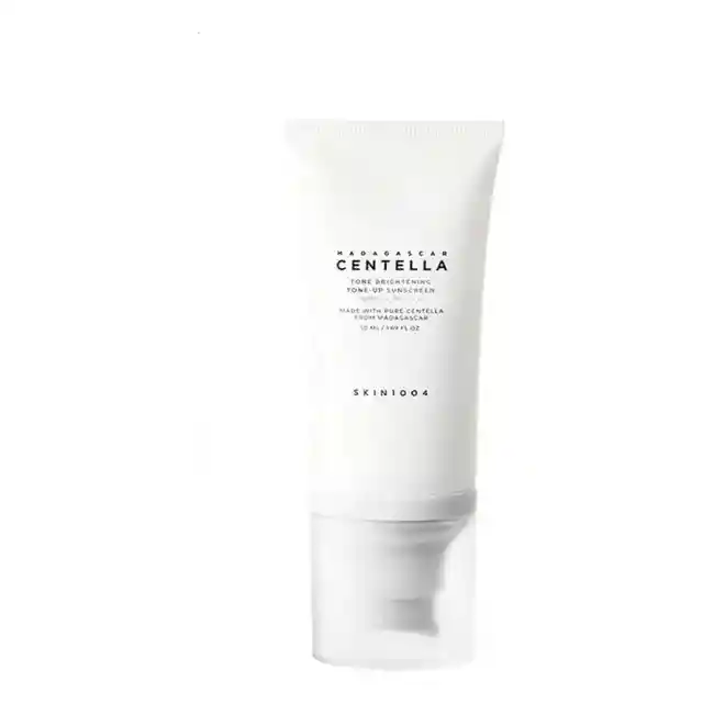 Protector solar facial SKIN1004 Madagascar Centella Tone Brightening Tone-Up Sunscreen que protege la piel contra los rayos UV mientras ilumina instantáneamente el rostro, mejora el tono desigual y aporta un acabado radiante y natural, enriquecido con centella asiática que calma, hidrata y fortalece la piel, dejando una textura ligera, fresca y sin sensación pesada, ideal para el uso diario.