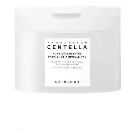 Discos faciales SKIN1004 Madagascar Centella Tone Brightening Dark Spot Ampoule Pad formulados con centella asiática pura de Madagascar que ayudan a iluminar la piel, reducir manchas oscuras y unificar el tono mientras hidratan profundamente, mejoran la textura y calman la piel sensible, aportando luminosidad, suavidad y un aspecto más uniforme y saludable, ideales para usar en la rutina diaria como tratamiento iluminador y calmante.