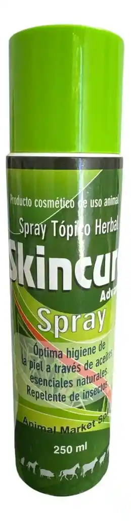 Skincure Advance es un spray analgésico y cicatrizante para usar en lesiones de la piel. Su fórmula con aceites esenciales ayuda a cicatrizar heridas y su función antiinflamatoria, antifúngica y antibacteriana protegen la piel de la mascota, mientras la ayudan a regenerarse y sanar las heridas. Además, tiene incorporado un repelente de insectos que ayuda a evitar que éstos se posen en la herida o en la piel que está sanando. Sirve para tratar: Heridas, picazón, granos. Enfermedades de la piel como eczema, tiña, sarna, psoriasis, dermatomicosis, entre otras. Lesiones por quemaduras y picaduras de pulgas u otros insectos. Características: Formulado con aceites esenciales de pino Indio, para tratar enfermedades de la piel, con propiedades antioxidantes. Cedro del Himalaya, con propiedades antisépticas, insecticidas, antifúngicas, antioxidantes y antiinflamatorias. Eucalipto, con propiedades antibacterianas, antimicrobianas y analgésicas. Con aceite de cúrcuma, que tiene propiedades insecticidas, antimicrobianas, antifúngicas y antioxidantes. Es un poderoso antiinflamatorio, anti picazón y antimicrobiano Es efectivo en el tratamiento de todo tipo de heridas en la piel Apto para perros, gatos, equinos, cerdos y bovinos Uso tópico Modo de uso: Limpiar la zona afectada y aplicar Skincure Advance en spray directamente en la piel. Dejar reposar. Usar 2 a 3 veces al día. CONTIENE: 250 ml.