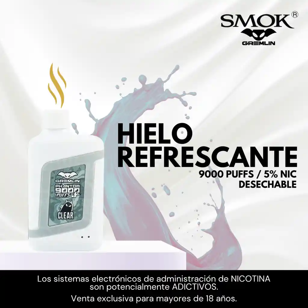 En una colaboración con la ya tradicional marca de cigarros electrónicos Smok® se desarrolla el Cigarro electrónico desechable modelo Phantom Series 9000, con alta calidad en sus materiales y diseños elegantes, que te entregan un dispositivo de una ergonomía amigable y gran duración Amplia gama de sabores tropicales llenará cada uno de tus sentidos, ideal para un uso simple sin complicaciones de recargas o cambios de resistencias. – 15ml de líquido en total – Flujo de aire ajustable – 9000 puffs aproximado – Batería de 800 mAh. – Puerto de carga USB C y se recomienda siempre cargar tu dispositivo en una baja carga como un Laptop 20 min – Multifuncional luz LED (Líquido y batería)