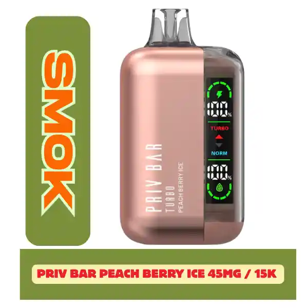 Sabor: Disponible , disfruta de una explosión frutal con el Peach Berry Ice Priv Bar Turbo. Las notas de durazno se fusionan perfectamente con una mezcla de frutos rojos y un toque helado, creando el equilibrio perfecto entre fruta y frescura en cada calada. Marca: Smok Priv Bar Contenido de e-liquid: 16 ml Nivel de nicotina: 50 mg Caladas por dispositivo: 10.000 (Modo Turbo) / 15.000 (Modo Normal) Batería: 800 mAh (recargable vía USB-C) Modo Turbo: mayor potencia para un sabor más intenso y caladas más grandes Pantalla LED: indicador de batería, nivel de e-liquid y modo de potencia Flujo de aire ajustable