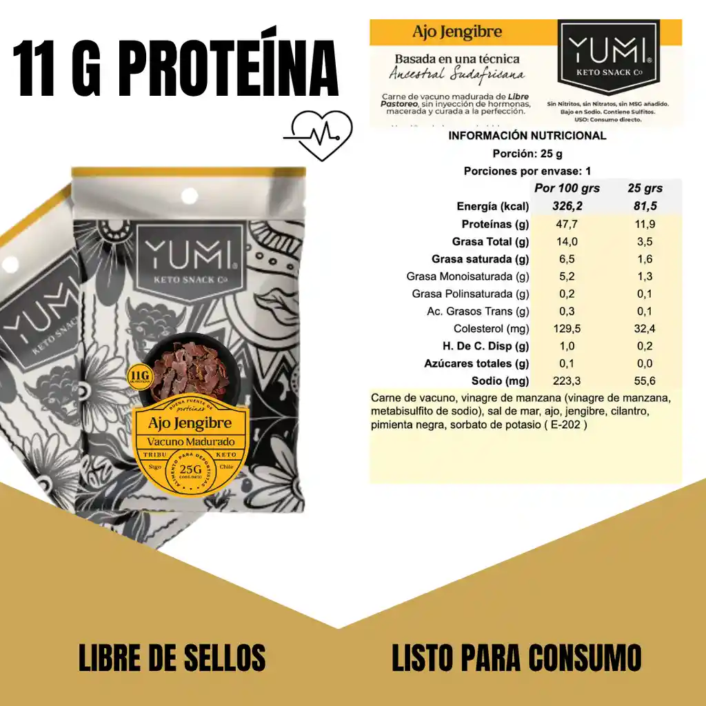 Yumi® Ajo Jengibre es carne de vacuno premium de 25g. Un snack full proteína con un sabor intenso y aromático. Es bajo en carbohidratos, sin azúcar y LIBRE DE SELLOS. Olvídate del charqui duro; este viene en finas láminas con una textura BLANDA y un sabor incomparable. Consúmelo en la oficina, como merienda, y alcanza tus niveles de proteína. ¡Vuelve a lo ancestral en versión gourmet! Te invitamos a probarlo, no podrás parar de comerlos.