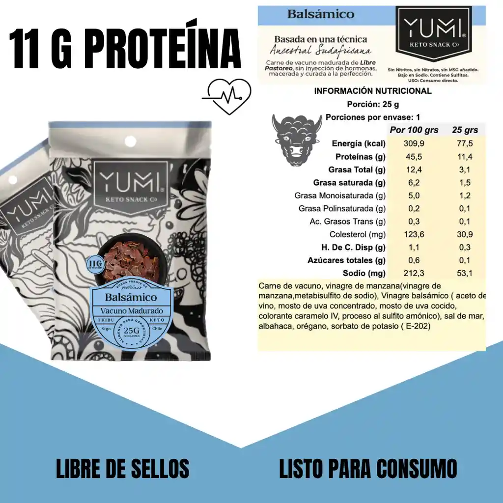 Yumi® Balsámico. Este no es solo un snack, es una experiencia gourmet en 25 gramos. Utilizamos nuestro vacuno de libre pastoreo, curado a la perfección para lograr una textura suave, casi sedosa y fácil de masticar (¡olvídate del charqui duro!). El sabor: un marinado elegante con la acidez compleja del vinagre balsámico, complementado por notas frescas de albahaca y orégano. Es el maridaje perfecto entre la fuerza de la proteína y la delicadeza de la cocina mediterránea. Tu Elección Inteligente y Distinguida: 🏅 Sabor Gourmet: Un perfil que eleva cualquier picoteo, ideal con un vino o para impresionar. 💪 Alto Rendimiento: La máxima fuente de proteína que te mantiene saciado y enfocado. ✅ Estilo de Vida Consciente: Cero sellos, Keto-Friendly, y naturalmente sin azúcar. ¡Atrévete a probar la elegancia! Pide tu Yumi® Balsámico y haz de tu pausa un momento premium.