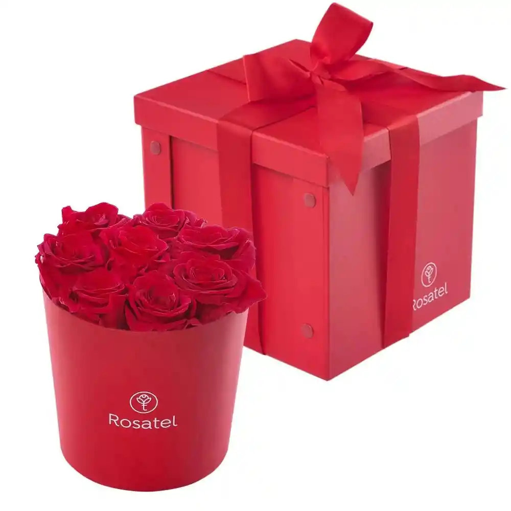 Sombrerera Roja Mediana con 8 Rosas Preservadas Rojas en Caja Roja