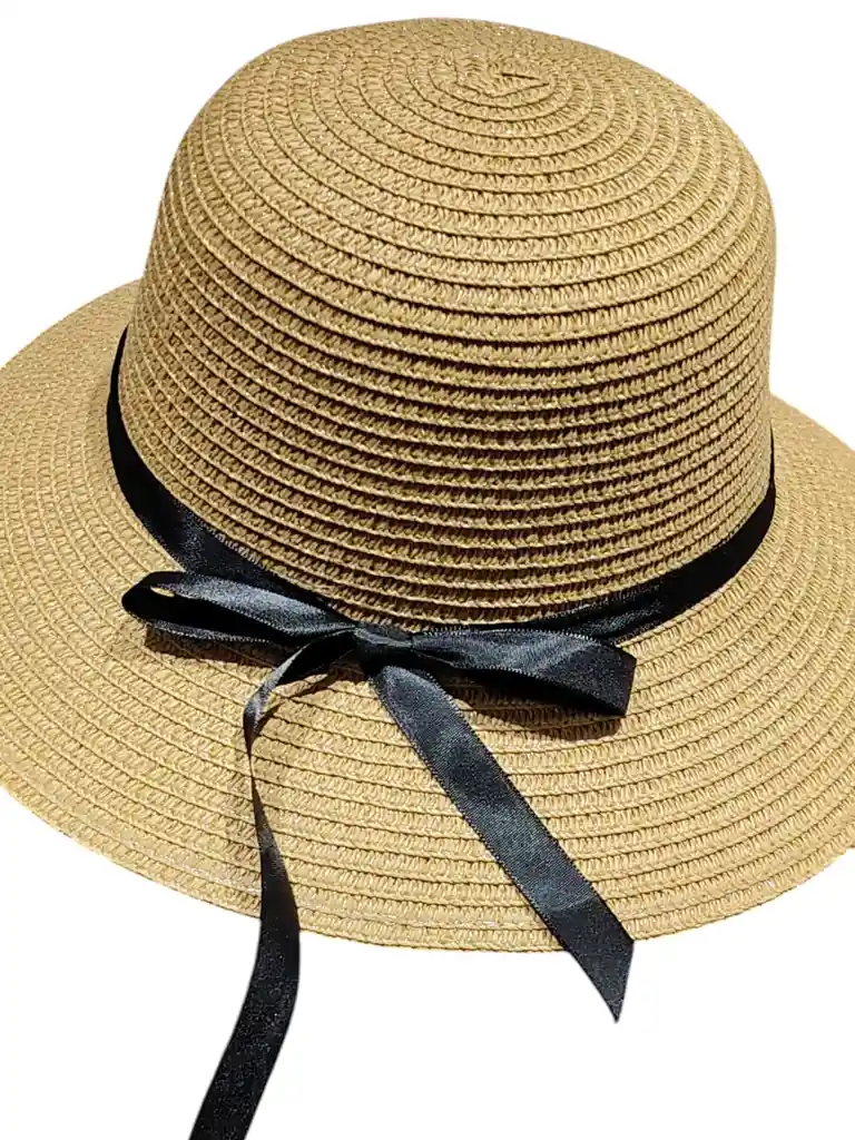 Sombrero tejido en fibra estilo palma en tono caqui, con una silueta limpia y equilibrada. Incorpora un lazo decorativo en color negro integrado al diseño, aportando un contraste elegante y un acento sofisticado sin perder naturalidad. Una pieza ligera y atemporal, pensada para complementar looks de verano, resort o ciudad con un sello moderno y distintivo de Cafuné Studio.